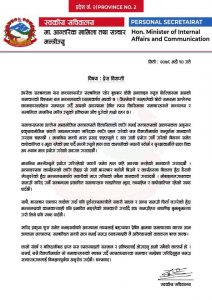 वीरगञ्ज १० भदौ । प्रदेश नं २ आन्तरिक मामिला तथा संचार मन्त्रालयले बुधबार केहि अनलाइन न्युज पोर्टलहरुमा आएको समाचारको विषयमा मन्त्रालयको निजि सचिवालयले प्रेस विज्ञप्ती निकालदै ध्यानाकर्षण भएको छ । जिम्मेवारी सम्हालेको छोटो समयमा उल्लेख्य गर्दै कामकारवाहीहरु सम्पादन गर्दै आएको अवस्थामा प्रेषित त्यस किसिमका समाचारहरुले मन्त्रालय र सम्बन्धित मन्त्रि ज्युको प्रतिष्ष्ठामा आँच पुगेको विज्ञप्तीमा उल्लेख गरीएको छ ।