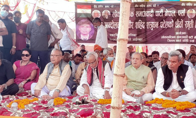 लोकतान्त्रिक सामाजबादी पार्टी पर्साले शहिद सत्रुधन पटेलको गाउ पकहा चौकमा आयोजना गरेको स्मृती सभामा लोसपाका कार्यकारीणी समिती सदस्य तथा पुर्व मन्त्री लक्षुमनलाल कर्ण , कार्यकारीणी समिती सदस्य तथा प्रदेश नं.२ का पुर्व मन्त्री जितेन्द्र सोनल , प्रदेशसभा सदस्य प्रहलाद गिरी , रमेश पटेल ,नेताहरु श्शिकपुर मिया , निजामुदिन समानी ,युवा नेता ओमप्रकाश सरार्फ लगायतका नेताहरुले सम्बोधन गरेका थिए ।