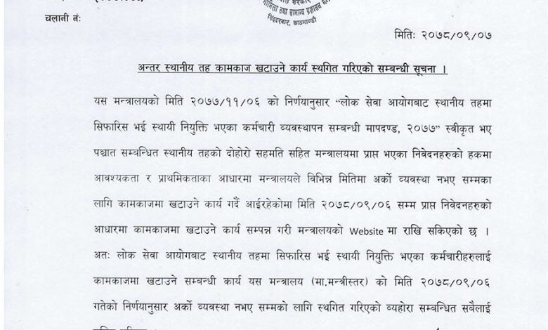मन्त्रालयले जारी गरेको सूचनामा लोक सेवा आयोगबाट स्थानीय तहमा सिफारिस भई स्थायी नियुक्त भएका कर्मचारीहरुलाई कामकाजमा खटाउने सम्बन्धी कार्य अर्को व्यवस्था नभएसम्मका लागि स्थगित गरिएको उल्लेख छ । यसअघि मन्त्रालयले आवश्यकता र प्राथमिकताका आधारमा अर्को व्यवस्था नभएसम्मका लागि स्थायी नियुक्त कर्मचारीहरुलाई कामकाजमा खटाउँदै आएको थियो ।