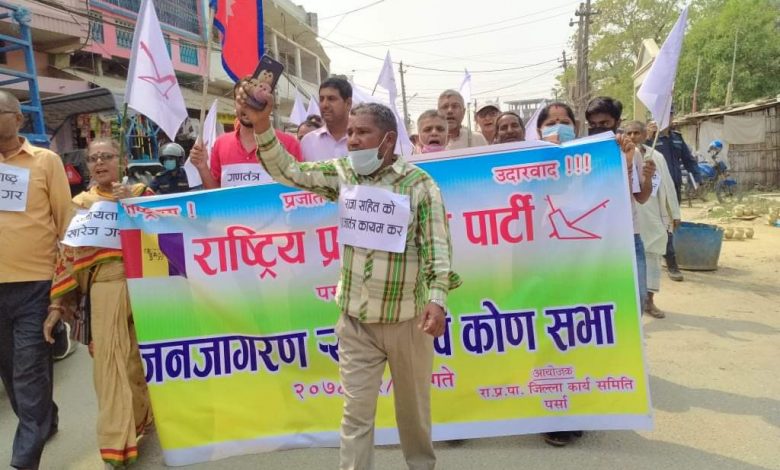 राष्ट्रिय प्रजातन्त्र पार्टी पर्सा ले र्याली तथा काण सभा सम्पन्न गरेको छ। र्याली मा बिभिन्न नारा सहित का पेलेकार्ड मा आफ्नो जिउमा टासी हिन्दू राष्ट्र कायम गर, राजा सहितको प्रजातन्त्र कायम गर, संघियता खारेज गर,MCC खारेज गर, भरष्टचारीलाइ कार्वाही गर, गणतन्त्र खारेज गरे माग गर्दै र्याली, प्रदर्शन र कोणसभाहरू सम्पन्न गरेका समाचारहरू प्राप्त भएका छन् ।
