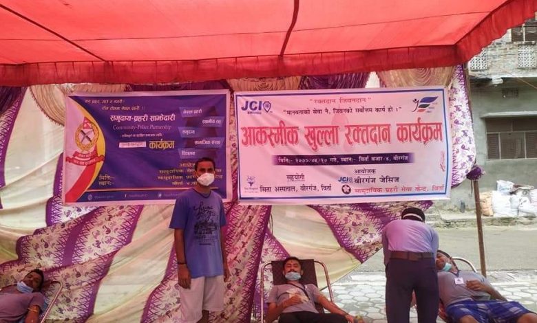 बिरगंज वडा न.४ स्थित बिर्ता बजारमा बिरगंज जेसिजका अध्यक्ष मुकेश सिंह र सा. से. के .का अध्यक्ष शालिकराम प्रसाद साह कानुको संयुक्त सभापतित्वमा गरिएको आकस्मिक रक्तदान कार्यक्रममा ४० जनाले रक्तदान गरेका थिए ।