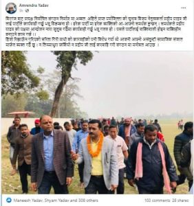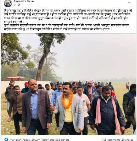 ‘जनताबाट प्रत्यक्ष रुपा निवार्चित संगठन निर्माणमा अब्बल, अहिले प्राप्त पर्सा जिल्लाको चुनाव बिजय नेतृत्वकर्ता प्रदीप यादवजीलाई पार्टीले कार्यवाही गर्छु भन्नु विडम्बना पुणर् निणर्य, अमरेन्द्रले भनेका छन- ‘हरेक पार्टीमा हरेक ब्यक्तिको आ-आफनो समर्थक हुन्छन, समर्थकले नेताको पक्षमा आन्दोलन नारा जुलुस गर्दैमा कार्यवाही गर्छु भन्नू गलत हो, यसले पार्टीलाई शक्तिशाली होइन शक्तिहीन बनाउने काम गर्छ ।