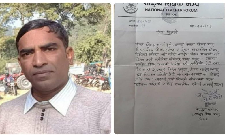 मिती २०७८ पुष ९ गते सुक्रबार दिन राष्ट्रिय शिक्षक मञ्च पर्सा को तदर्थ समिति को संयोजक उमेश ठाकुर को ठाउँमा राष्ट्रिय शिक्षक मञ्च को केन्द्रिय कार्य समितिको निर्णय अनुसार नेपाल राष्ट्रिय आधारभुत बिधालय प्रसौनि बिर्ता वीरगंज महानगरपालिका वडा नं २३ का शिक्षक प्रदिप प्रसाद साह लाइ राष्ट्रिय शिक्षक मञ्च पर्सा जिल्ला संयोजक मा न्युत्क गरिएको जारी प्रेस विज्ञप्ति मा उल्लेख गरिएको छ।