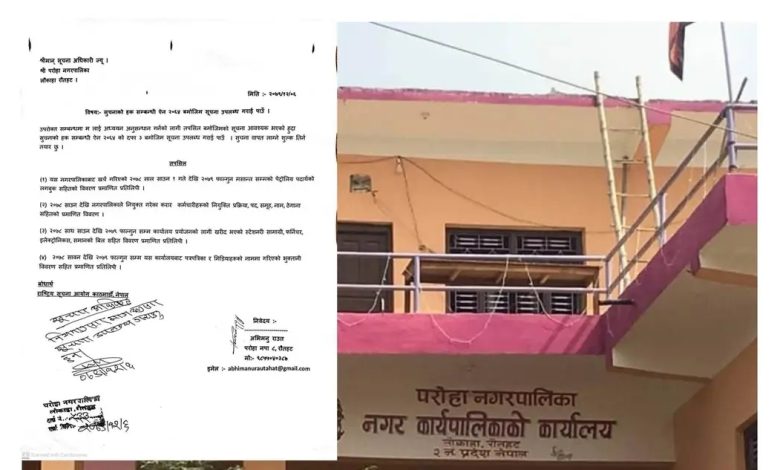रौतहट, १६ बैशाख । सार्वजनिक महत्व बोकेका बिषयमा परोहा नगरपालिकाले सुचना उपलब्ध गराउन आनाकानी गरेको छ । नेपालको संबिधानको धारा २७ तथा सूचनाको हक सम्बन्धि ऐन, २०६४ को दफा ३ र ७ अनुसार परोहा नगरपालिका संग माग गरिएको सूचना प्राप्त नभएको ह।