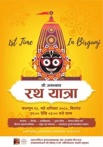 भारतको उडिसा राज्यको जगन्नाथ पुरीबाट यसको शूरुवात भए र यहाँ हरेक वर्ष डिसेम्वर महिनामा रथयात्रा हुने गरेको छ । तर उक्त रथयात्रा विश्वको कुनै न कुनै स्थानमा १२ महिनै हुँदै आइरहेको र बिरगंजमा पनि यो प्रथम वर्ष मनाउन लागिएको आयोजकले जानकारी गराएका छन ।