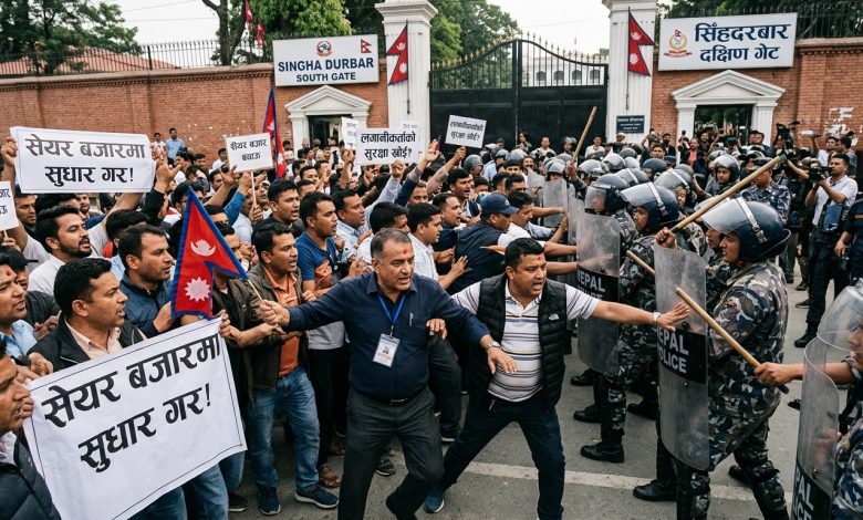 सिंहदरबार दक्षिणगेटमा सेयर लगानीकर्ता–प्रहरी धकेलाधकेल, आयल निगम अगाडि प्रदर्शन