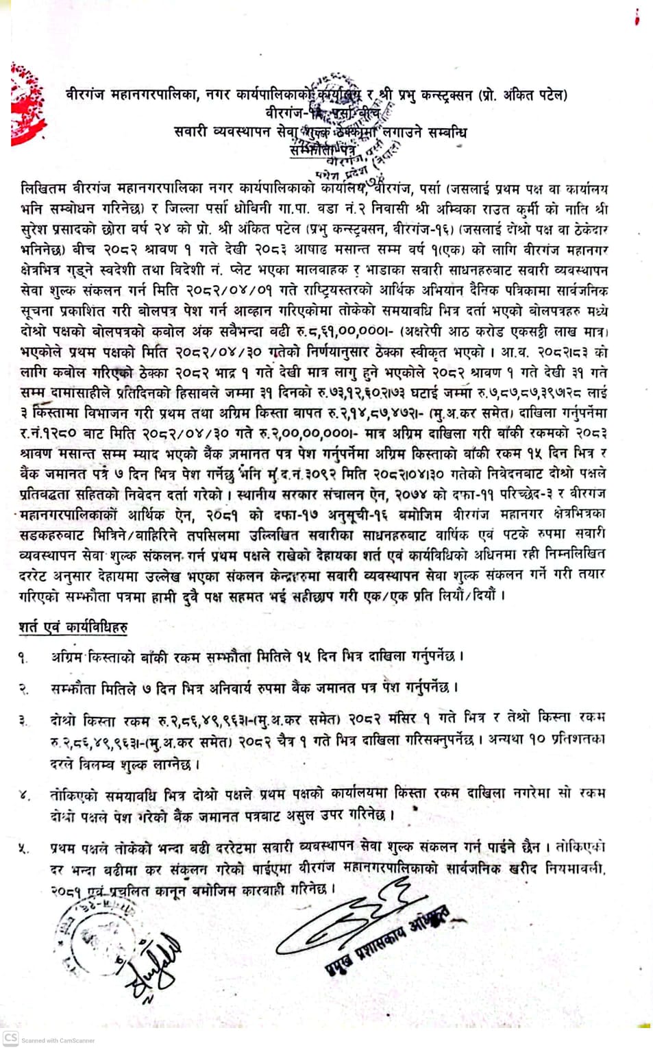 ठेक्का सम्झौताअनुसार प्रभु कन्स्ट्रक्शनले वीरगंज महानगरपालिकालाई रु. ८ करोड ६१ लाख बुझाउने गरी जिम्मेवारी लिएको थियो। तर संकलनमा रोक लागेपछि कम्पनीले दैनिक करिब ३ देखि ३.५ लाख रुपैयाँसम्म नोक्सानी व्यहोर्नुपरेको जनाएको छ।