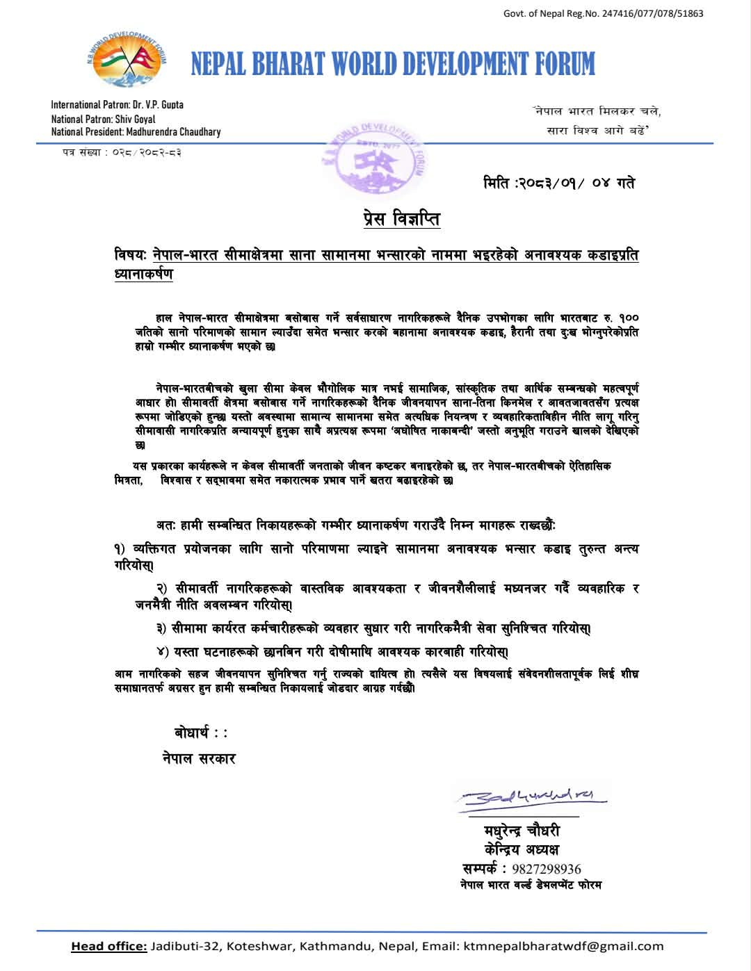 विज्ञप्तिमा नेपाल–भारतबीचको खुला सीमालाई सामाजिक, सांस्कृतिक तथा आर्थिक सम्बन्धको महत्वपूर्ण आधारका रूपमा उल्लेख गर्दै सीमावर्ती क्षेत्रमा बसोबास गर्ने नागरिकहरूको जीवनयापन साना किनमेल र आवतजावतमा निर्भर रहने बताइएको छ। यस्तो अवस्थामा व्यवहारिकताविहीन नीति लागू गरिनुले सर्वसाधारणमा ‘अघोषित नाकाबन्दी’ जस्तो अनुभूति गराएको फोरमको दाबी छ।