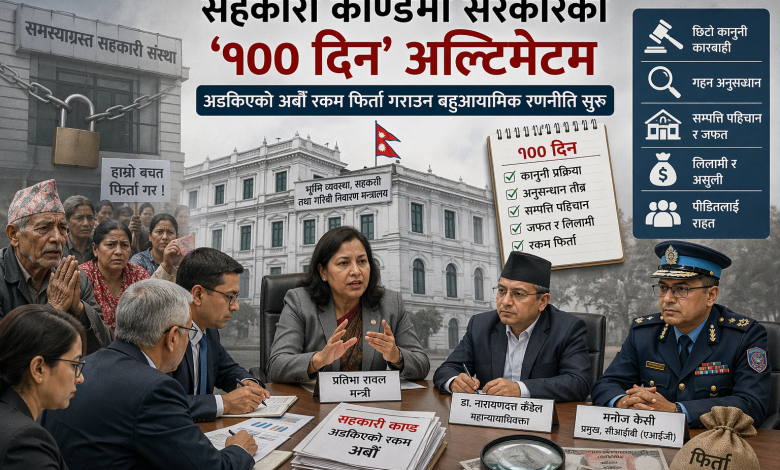 समस्याग्रस्त सहकारी संस्थाहरूमा अड्किएको बचतकर्ताको अर्बौं रुपैयाँ फिर्ता गराउने दबाब बढिरहेका बेला सरकारले ‘१०० दिन’ को समयसीमा तोकेर निर्णायक पहल सुरु गरेको छ। भूमि व्यवस्था, सहकारी तथा गरिबी निवारण मन्त्रालयले पीडितको रकम फिर्ता प्रक्रिया अगाडि बढाउन कानुनी, अनुसन्धान र वित्तीय संयन्त्रलाई एकैसाथ परिचालन गर्ने रणनीति अघि सारेको हो।