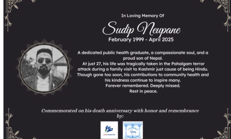 उक्त आक्रमणमा ज्यान गुमाएका नेपाली नागरिक सुदीप न्यौपानेसहित निर्दोष व्यक्तिहरूप्रति श्रद्धाञ्जली व्यक्त गर्दै फाउन्डेशनले पीडित परिवारप्रति हार्दिक समवेदना प्रकट गरेको जनाएको छ। २७ वर्षीय न्यौपाने सार्वजनिक स्वास्थ्य विषयका स्नातक थिए र समाजसेवामा सक्रिय रूपमा संलग्न रहेका थिए।