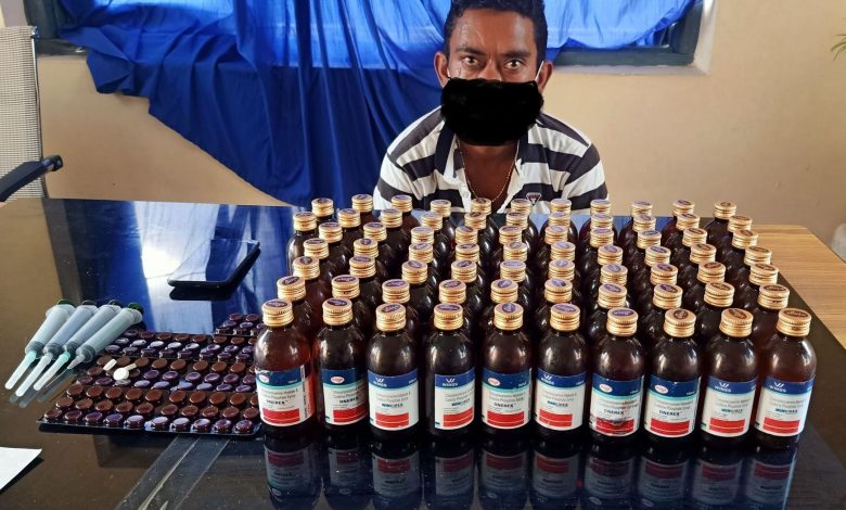 उनको डेराबाट प्रहरीले लागु औषध विनसिरेक्स ७२ बोत्तल र नाईट्राभेट ट्याब्लेट १ सय ५ पिस बरामद गरेको छ ।