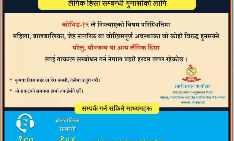 कोभिड-१९ ले निम्त्याएको विषम परिस्थितिमा महिला, बालबालिका, जेष्ठ नागरिक वा जोखिमपूर्ण अवस्थाका जो कोही विरुद्ध हुनसक्ने घरेलु, यौनजन्य वा अन्य लैंगिक हिंसालाई तत्काल सम्बोधन गर्न नेपाल प्रहरी हरदम तत्पर रहेको छ ।