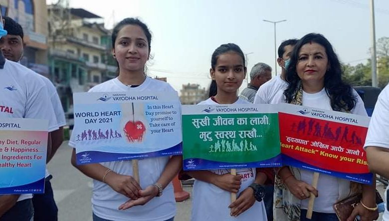 दीपेन्द्र यादव/बारा, ९ असोज।विश्व मुटु दिवसको अवसरमा नारायणी वयोधा अस्पताल बिरगंजको आयोजनामा सिमरा चोकमा जनचेतनामुलक कार्यक्रम गरि मनाएको छ । विश्व स्वास्थ्य संगठनको तथ्यांक अनुसार विश्वमा कुल जनसंख्याको ८० प्रतिशत र नेपालमा गरिएको अध्ययन अनुसार दुई तिहाई नेपालीहरु मुटुको रोग, मधुमेह, मृगौलाको रोग क्यान्सर लगायतका नसर्ने रोगको जोखिमबाट ग्रसित छन ।