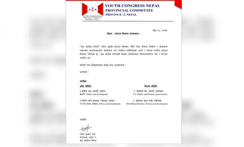 युथ काङ्ग्रेस नेपाल प्रदेश न २ ले सङ्गठन विस्तार गरेको छ। संगठनको प्रदेश सदस्यहरुमा सुमित झा, सप्तरी र नितेश कर्ण कायस्थ , सिराहाबाट रहेको छ।