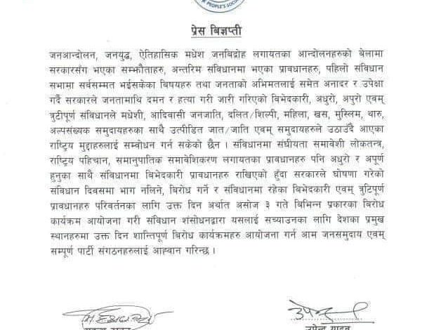 जनता समाजवादि पार्टिले संविधान दिवसमा भाग नलिने र विरोध कार्यक्रम गर्ने विज्ञप्ती जारि